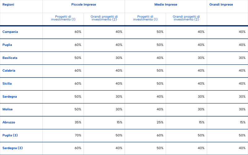 L’agevolazione richiesta, che si attesta con un’intensità dal 15% al 70%, è diversificata in ragione della dimensione dell’impresa e della geografia del progetto, secondo lo schema che segue: